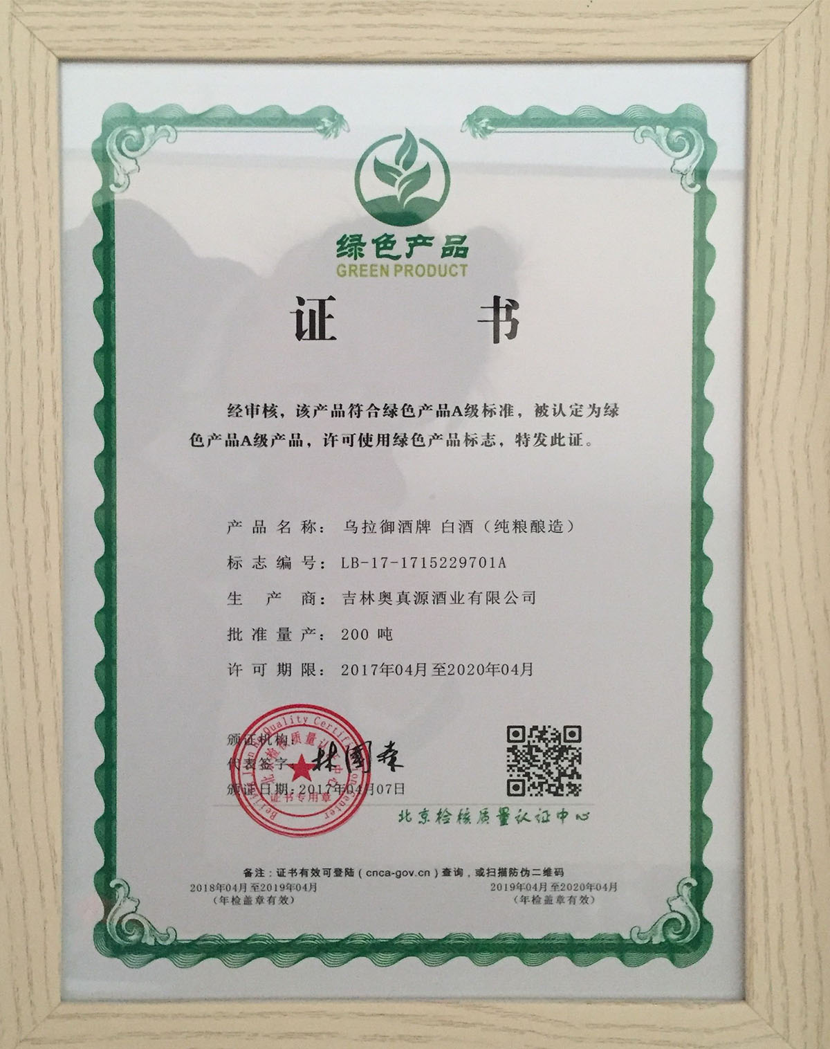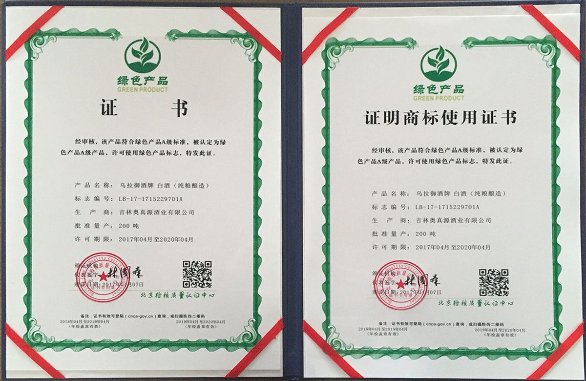 乌拉御酒牌白酒(纯粮酿造)经审核,该产品符合绿色产品A级标准,被认定为绿色产品A级产品,许可使用绿色产品标识。